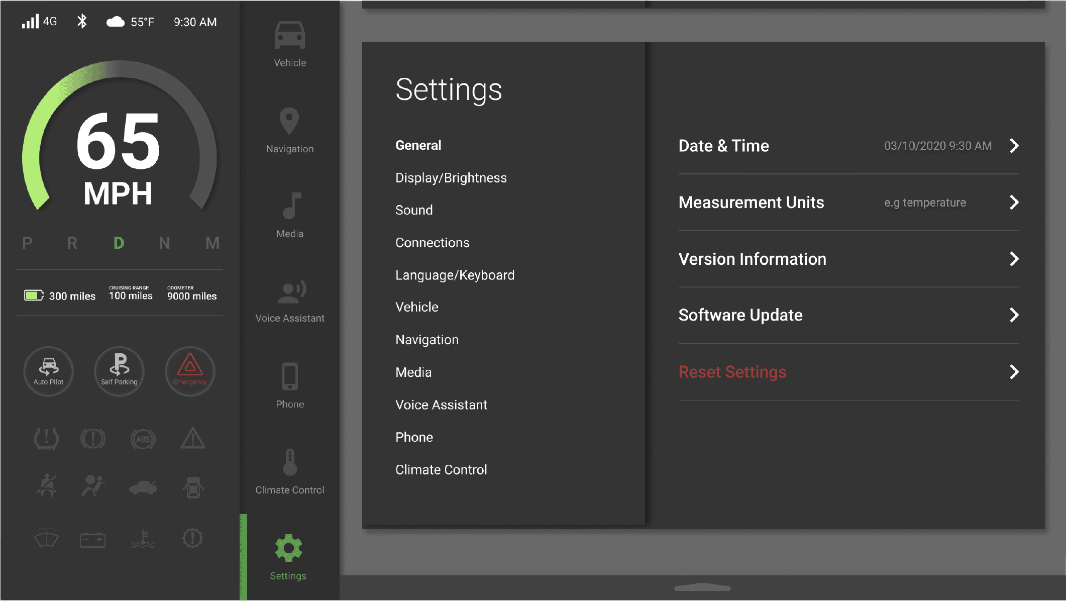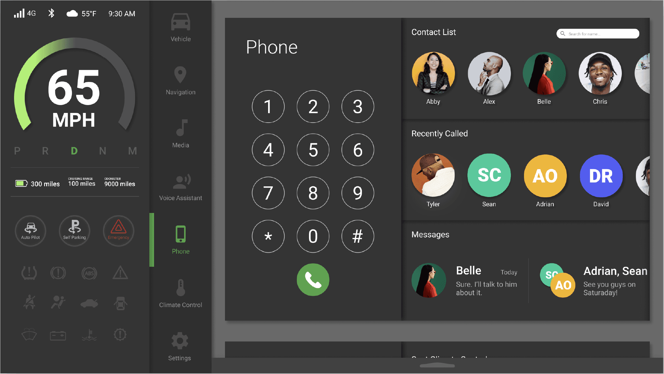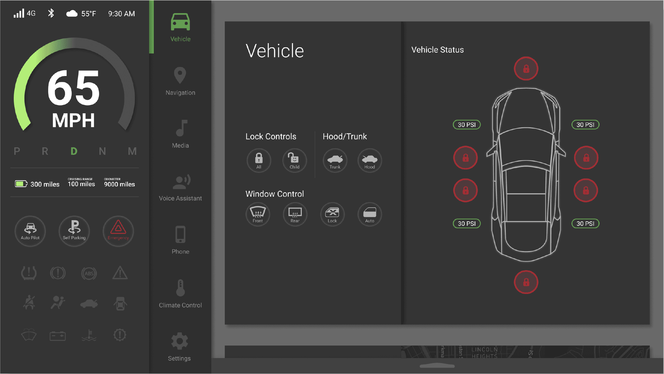 The interface deliberately prioritizes primary driving information, keeping secondary features accessible without competing for attention.